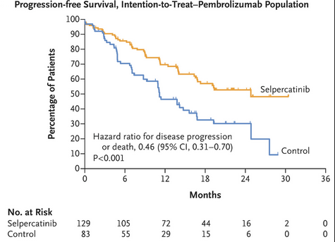 塞普替尼在治疗RET融合阳性方面展现出良好的疗效。研究显示,在既往接受过治疗的RET融合阳性甲状腺癌患者中,使用塞普替尼的治疗反应率(ORR)为79%,中位无进展生存期(PFS)为20.1个月,1年无进展生存率为64%。这些数据表明,塞普替尼对RET融合阳性的甲状腺癌患者具有显著的治疗效果。